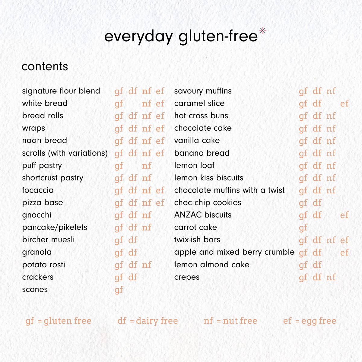 For those with allergies and sensitivities, these are the flours and ingredients we use in our recipes: sorghum flour, potato starch, tapioca starch, brown rice flour, guar gum, baking powder, psyllium husk, and yeast. For dietary requirements, check out the contents page recipe breakdown image below.